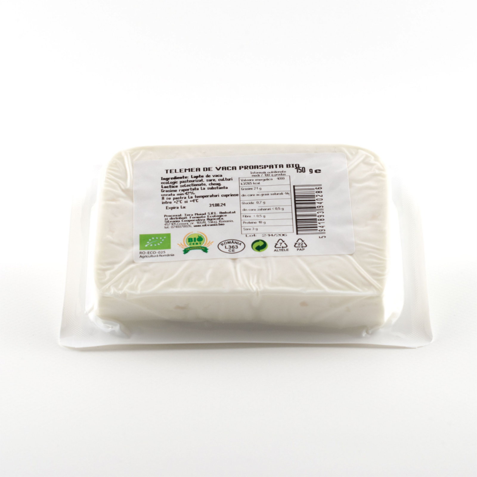 Lapte de vaca ecologic pasteurizat, sare, culturi lactice selectionate, cheag, Grasime raportata la substanta uscata min 42%