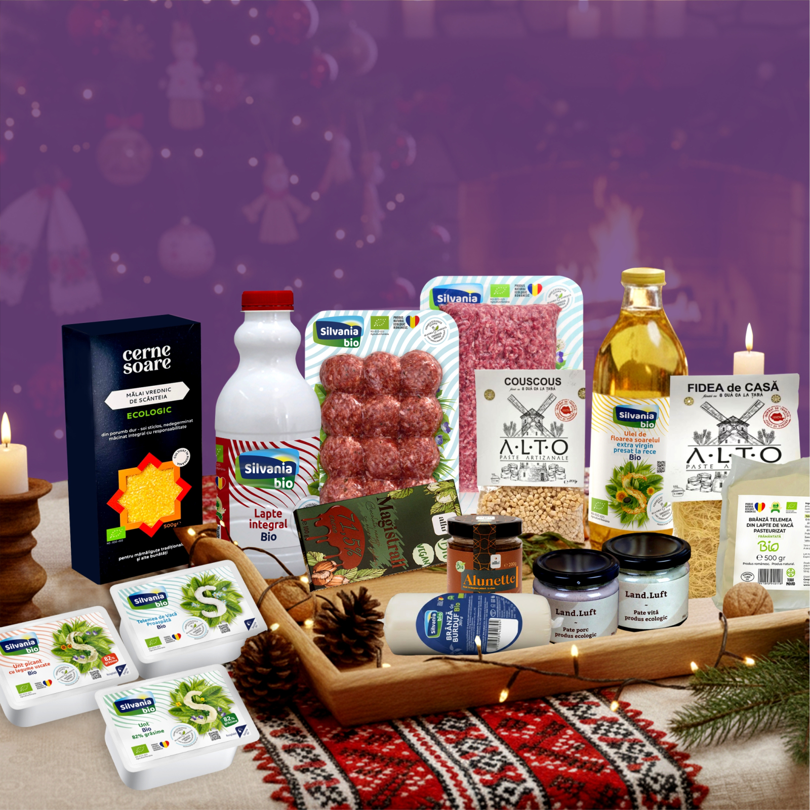 Pachetul Moș Crăciun este creat pentru a satisface cele mai exigente gusturi și pentru a asigura o masă festivă completă, de la aperitive la desert. Acest pachet este o selecție de produse esențiale de la Silvania Bio, combinate cu delicatese gourmet de la alți producători preocupați să ofere produse bio (Landluft, Magistral, Allu).
